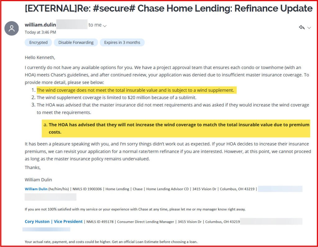 In the previous post, I shared that Chase Bank declined my refinance due to concerns about the association’s master insurance coverage after more than 9 weeks of the association delays in responding to the bank.